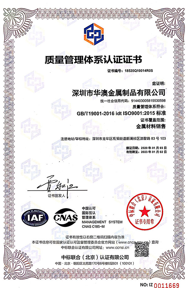 深圳市華澳金屬制品有限公司成立于2011年,擁有20多人的研發(fā)團(tuán)隊(duì),10+年專注金屬原材料生產(chǎn)經(jīng)驗(yàn),主打產(chǎn)品系列包含:鋁合金系列、不銹鋼系列、鈦合金系列,并通過(guò)ISO質(zhì)量管理體系認(rèn)證9001:2015,產(chǎn)品符合“SGS"、"RoHS"環(huán)保認(rèn)證。